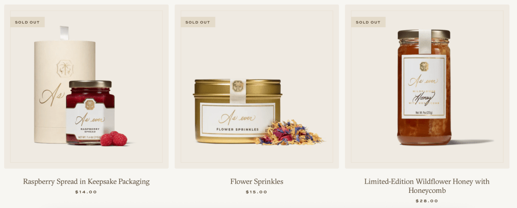 The brand’s name was eventually changed to As Ever in 2025. The first As Ever products went on sale on April 2, including the famous raspberry spread, flower sprinkles, wildflower honey, three types of tea, and more, with all products selling out within an hour. Products from this launch, particularly the flower sprinkles, were featured throughout the first season of With Love, Meghan. Meghan later revealed in a message to As Ever subscribers that the brand would be releasing new products “seasonally.”