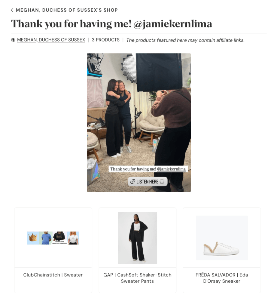 It appears that Meghan is back in her influencer era. Shortly after With Love premiered, Meghan launched a ShopMy storefront. Storefronts like these allow celebrities/influencers to link their favorite clothing, beauty items, accessories, etc. for their audiences to shop. The platform itself and the storefront owner make a commission off of each purchase made through their link. I’ve attached a screenshot below from her most recent post on her ShopMy store.
